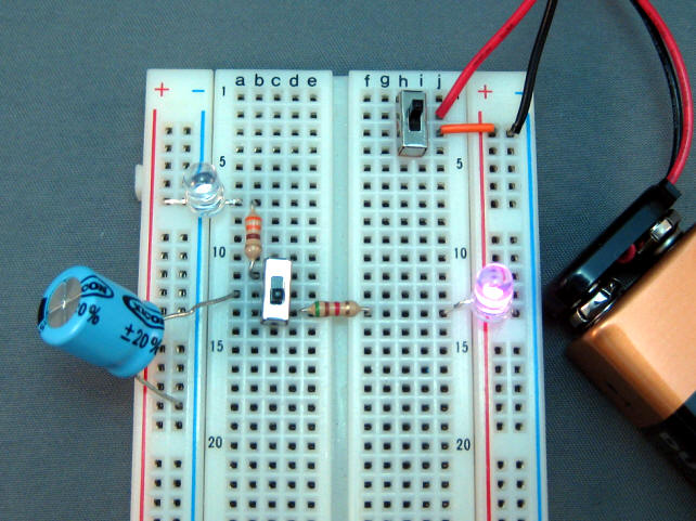 Pour vérifier que la LED1 utilise l'énergie du condensateur, et non celle de la batterie, pour s'allumer, essayez de nouveau votre circuit, mais débranchez la batterie après avoir chargé le condensateur.