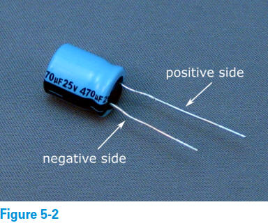 Remarquez la valeur « 470 μF 25 V » indiquée (et répétée) sur le condensateur de la figure 5-2.