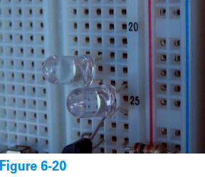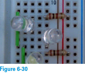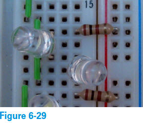 4. Insérez deux LED ajustées (appelons-les LED3 et LED4) dans le Breadbord, comme illustré sur la figure 6-29 :