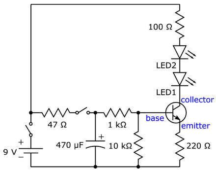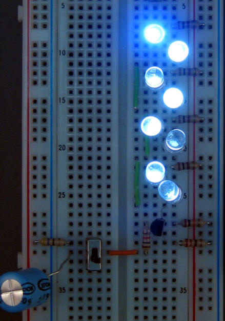 Il a deux transistors, deux condensateurs et quatre résistances pour accomplir un marche-arrêt à vitesse variable des LEDs.