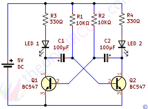 La fréquence de clignotement des LEDs peut être augmentée ou diminuée en modifiant les valeurs des résistances R2, R3 et des condensateurs C1, C2.