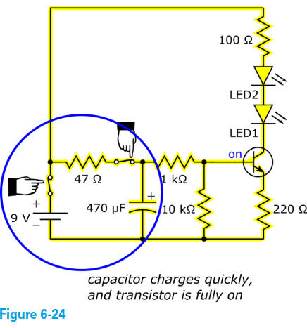 Commençons par un fonctionnement assumé du circuit avec le condensateur de 100 uF qui maintien le Q2 à l'état "ARRÊT'. Le Q1 est alors en "MARCHE ' et le condensateur de 100 uF est chargé rapidement à travers sa résistance en série de 10K et de la jonction B-E du Q1 par la pile.