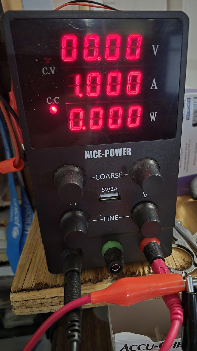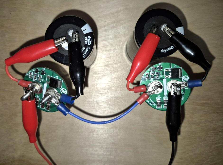 To charge the 500F capacitor Using the power supply Limit the current to 1A. Without a protection module The voltage must be a maximum of 2.7V. Charge until the amperage is very low. Takes approximately from 22 to 70 minutes per capacitor. |