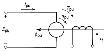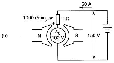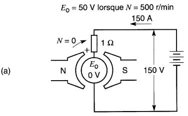 L'induit d'une machine bipolaire, dont la résistance est de 1Ω, génère une tension de 50V lorsque sa vitesse de rotation est 500 r/min. L'inducteur est composé de deux aimants permanents. L'induit est raccordé à une source de 150V (Fig. 28-3).