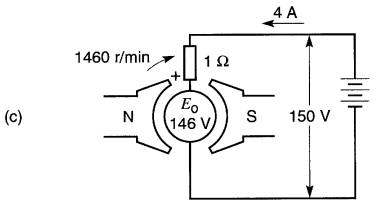 Lorsque le moteur atteint une vitesse de 1460 r/min (Fig. 28-3c) la f.c.é.m. sera 146V, soit une tension presque égale à la tension de la source. Dans ces circonstances, le courant dans l'induit n'est que :