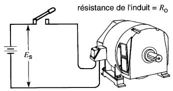 Avant que l'interrupteur ne soit fermé, l'induit est immobile. Dès qu'il est fermé, la source fait passer un courant très intense dans l'induit, car la résistance Ro de celui-ci est très faible (Fig. 28-2).