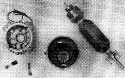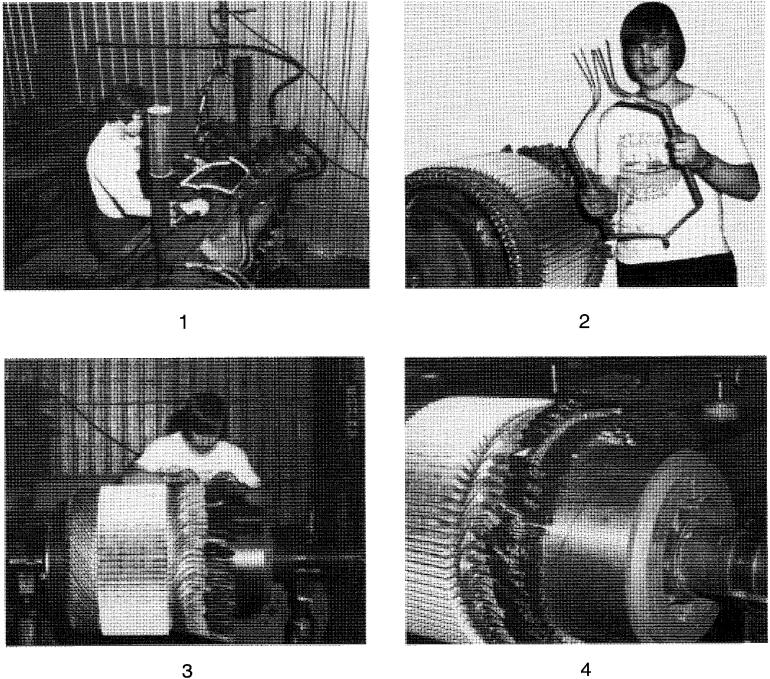 Figure 28-4b Bobinage d'un induit de moteur à c.c. de 225 kW pour pelle mécanique. 1) machine-outil utilisée pour former les bobines ; 2) bobine formée prête à être introduite dans les encoches; 3) et 4) raccordement des bobines au collecteur de 243 lames