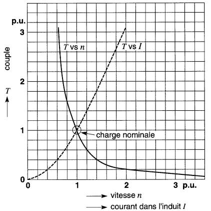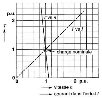 La courbe donnant les valeurs relatives du couple T en fonction de la vitesse n indique que la vitesse varie seulement de 1,1 p.u. à 0,9 p.u. lorsque le couple augmente de zéro à 2 p.u. La deuxième courbe montre que le couple est proportionnel au courant d'induit dans la région comprise entre zéro et 2 p.u.