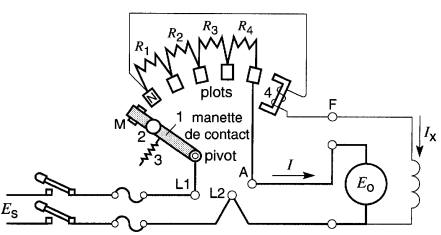En même temps, un courant I commence à circuler dans l'induit. Ce courant est limité par la somme des quatre résistances plus la résistance Ro de l'induit. Le moteur accélère, et le courant I diminue progressivement. On fait alors avancer la manette au plot suivant et le courant prend de nouveau une valeur relativement élevée.