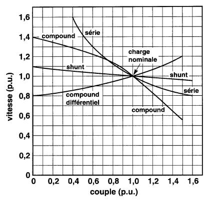 Cependant, lors du démarrage, le courant d'induit est supérieur au courant nominal; le flux est donc supérieur au flux obtenu à pleine charge. Par conséquent, le couple de démarrage d'un moteur série excède celui d'un moteur shunt. Par contre, lorsque la charge est inférieure à la puissance nominale, le courant d'induit et le flux par pôle sont inférieurs aux valeurs normales.