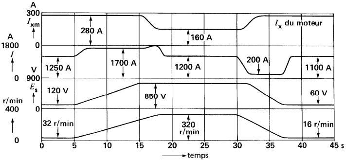 Figure 28-35 Tension, courants et vitesse d'un moteur de laminoir (problème 28-16)