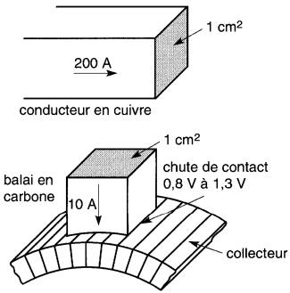 Dans les balais en carbone, on utilise des densités de courant beaucoup plus faibles que dans le cuivre, soit environ 10 A/cm² (Fig. 29-1).