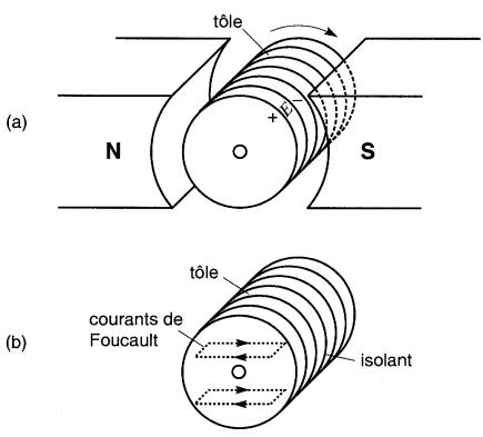 Ces courants, auxquels on donne le nom de courants de Foucault, provoquent un échauffement, par effet Joule, du noyau de fer (Fig. 29-2b). La chaleur dégagée correspond à une perte de puissance proportionnelle au carré de la vitesse de rotation et au carré de la densité de flux.