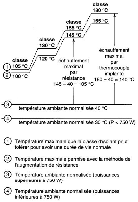 Pour la plupart des machines possédant un système d'isolation classe 105 °C, l'échauffement admissible mesuré par la méthode du thermomètre est de 40 °C.
