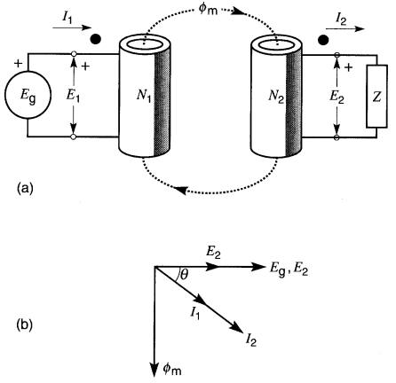 Compte tenu de ce qui précède, on peut tracer le diagramme vectoriel du transformateur idéal en charge (Fig. 30-8b). Si l'on suppose une charge résistive-inductive, le courant I2 sera en retard d'un angle θ sur la tension E2.
