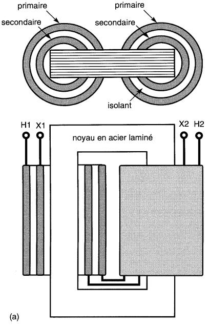 Avec cette construction, la presque totalité du flux Φ créé par le primaire est accrochée par le secondaire. Le flux de fuite n'est plus qu'une petite fraction du flux total, ce qui augmente la valeur de la tension induite E2 à vide et la maintient presque constante en charge.