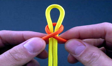 1. Commencez par des boucles créées au milieu de deux cordons. | 2. Laissez tomber l'un des cordons de 0,5 pouce, derrière la boucle de l'autre. |