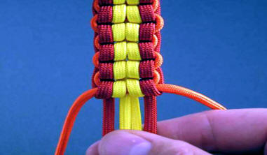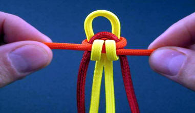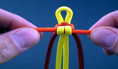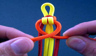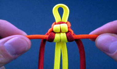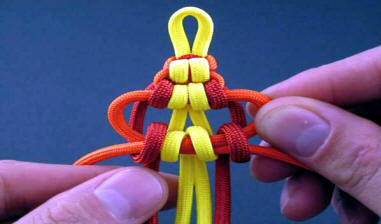15. Entourez les extrémités droite et gauche du troisième cordon autour des cordons croisés,... | 16. ...à l'intérieur d'eux-mêmes et à l'extérieur des cordons verticaux intérieurs. |